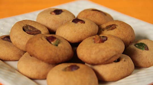 7- إضغطي بإصبعك على كلّ كرة لتصبح مسطحة الشكل، وضعي حبّة فستق حلبي في وسطها.
